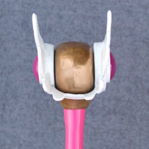 I started with the rod, as it was the easiest thing to get out of the way! The rod is a lightweight pine dowel that I flared at each end using a metal washer that was about 5mm wider in circumference than the dowel was, I flared it using putty :> after the putty dried, I sanded it down to make a nice smooth flare at each end! The rod, with its newly sanded flared ends received a white primer, another round of sanding, and then finally a bright pretty pink coat of paint! I also drilled a hole in either end of the dowel to allow for a smaller dowel (around 5mm in circumference) to be slotted and glued in place to hold the head and base piece in place!