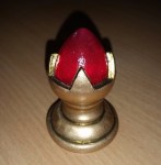 And finally, the pretty base piece! This entire piece is created with resin :> I hand-sculpted the piece, moulded it, and then poured tinted red (and sparkly!) resin into the mould (this was poured and cured at the same time and with the same batch of resin as the “nose” gem. After curing, the piece was de-moulded and sanded and the red gem was buffed and masked off; after the gem was masked, the rest of the piece was coated with two coats of the same super shiny gold spray paint. I then “antiqued” it a little bit by rubbing a darkened gold acrylic paint into the little nooks of the piece. The base piece was then glued to the rod with epoxy.