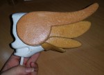 Next I created the head! The head is made from carved insulation foam with a worbla shell for strength, it was then sanded, primed, sanded again and then finally coated with a super shiny gold spray paint (which sadly doesn’t pick up in photos); the wings are made with a specially made pattern and craft foam, the foam was then sandwiched between worbla for extra strength, and like with the head the wings were also sanded, primed, and sanded again before they were then coated with a high-gloss white spray paint, and finally glued to the main piece (the head) with a super strong epoxy; the “nose” and “eye” gems of the head are made with tinted resin (and with a scary new type of resin too, if I might say so!) the three gems were then glued into the “nose cavity” and “eye sockets” with the same epoxy! This was then glued to the rod by drilling a hole in the insulation foam and gluing the 6mm dowel in place.