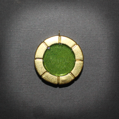 This pendant is made with resin and a mirror. It measures at around 4cm tall (1.57inches), around 4cm wide (1.57inches) and around 1cm thick (0.39inches).