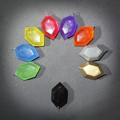 Rupees These pendants are made with resin. It measures at around 3.5cm tall (1.37inches), and around 2cm wide (0.78inches).