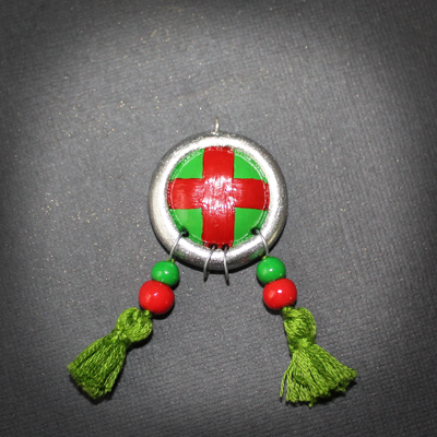 This pendant is made with sculpey and thread. It measures at around 3.5cm tall (1.37inches) without tassels measured and 6cm tall (2.36inches) with tassels measured; and it measures at around 3cm wide (1.18inches).