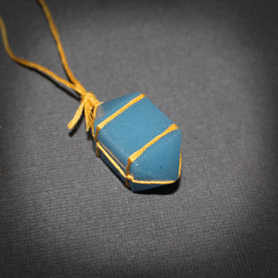 This pendant is made with resin and yellow thread. It measures at around 3cm tall (0.98inches), and around 1.5cm wide (1.29inches).
