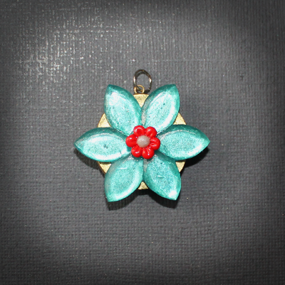 This pendant is made with resin, sculpey and paint. It measures at around 4cm tall (1.57inches), and around 4cm wide (1.57inches).