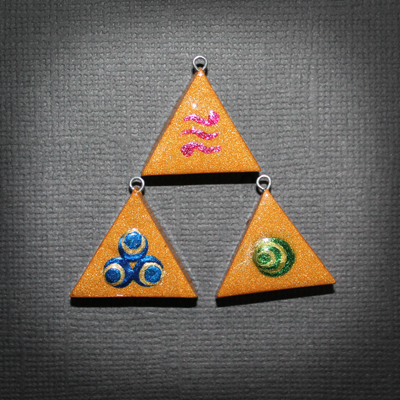 Each pendant is made with gold sculpey clay and red/blue/green paint. It measures at around 2cm tall (0.78inches) and around 2cm wide (0.78inches), each one varies in size as they are handmade.