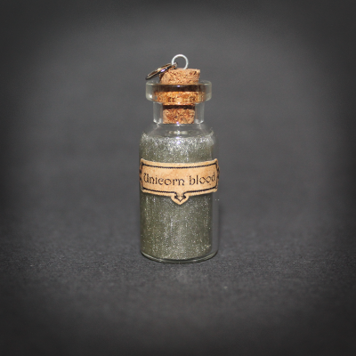 This pendant is made with silvery resin inside a mini glass bottle. It measures at around 3.5cm tall (1.37 inches) and around 1.5cm wide (0.59inches), each one varies a little as they are handmade.